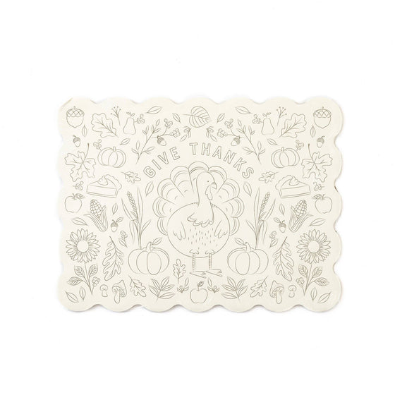 Make the kids' table the place to be with these festive coloring placemats. Featuring a whimsical turkey and festive sentiment "give thanks" these placemats are sure to be a favorite focal point of your Thanksgiving table for your loved ones both young and old!